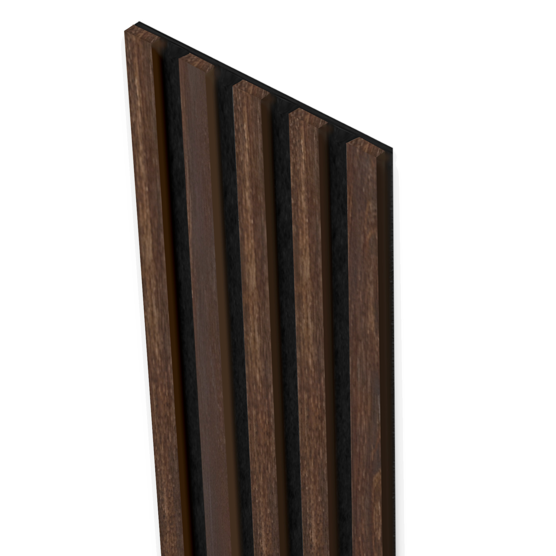 Kolor: Nut Materiał: MDF High Quality ++ Wykończenie: struktura drewna 3D Podkład: filc 3 mm Kolor filcu: czarny Wymiar panelu: 26,5 cm x 280 cm Wymiary lameli: mini 26,5 mm x 10 mm Szerokość odstępów: 26,5 mm Ilość lameli na filcu: 5